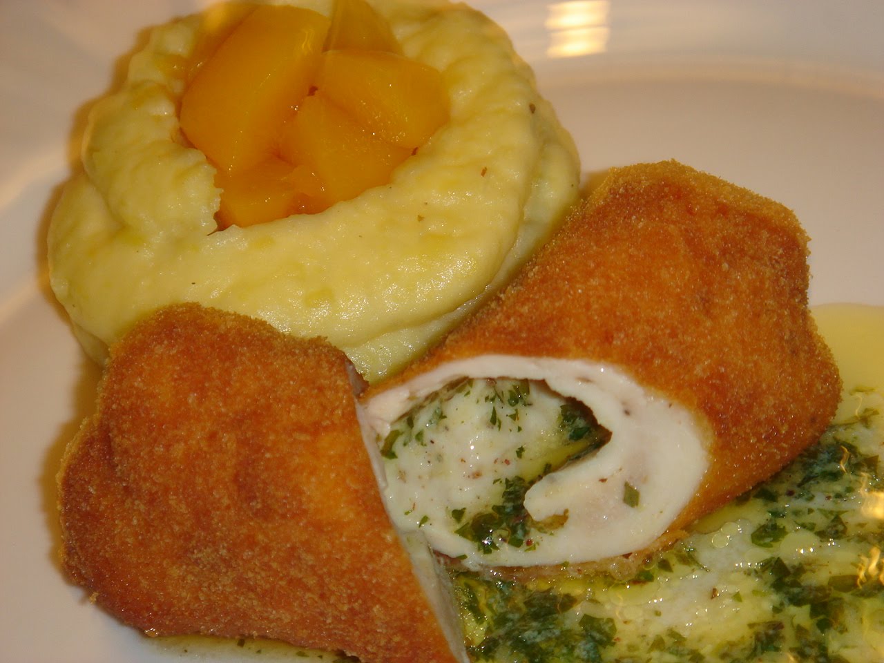 + Kijevi jércemell, burgonyapürével, mandulás őszibarackka